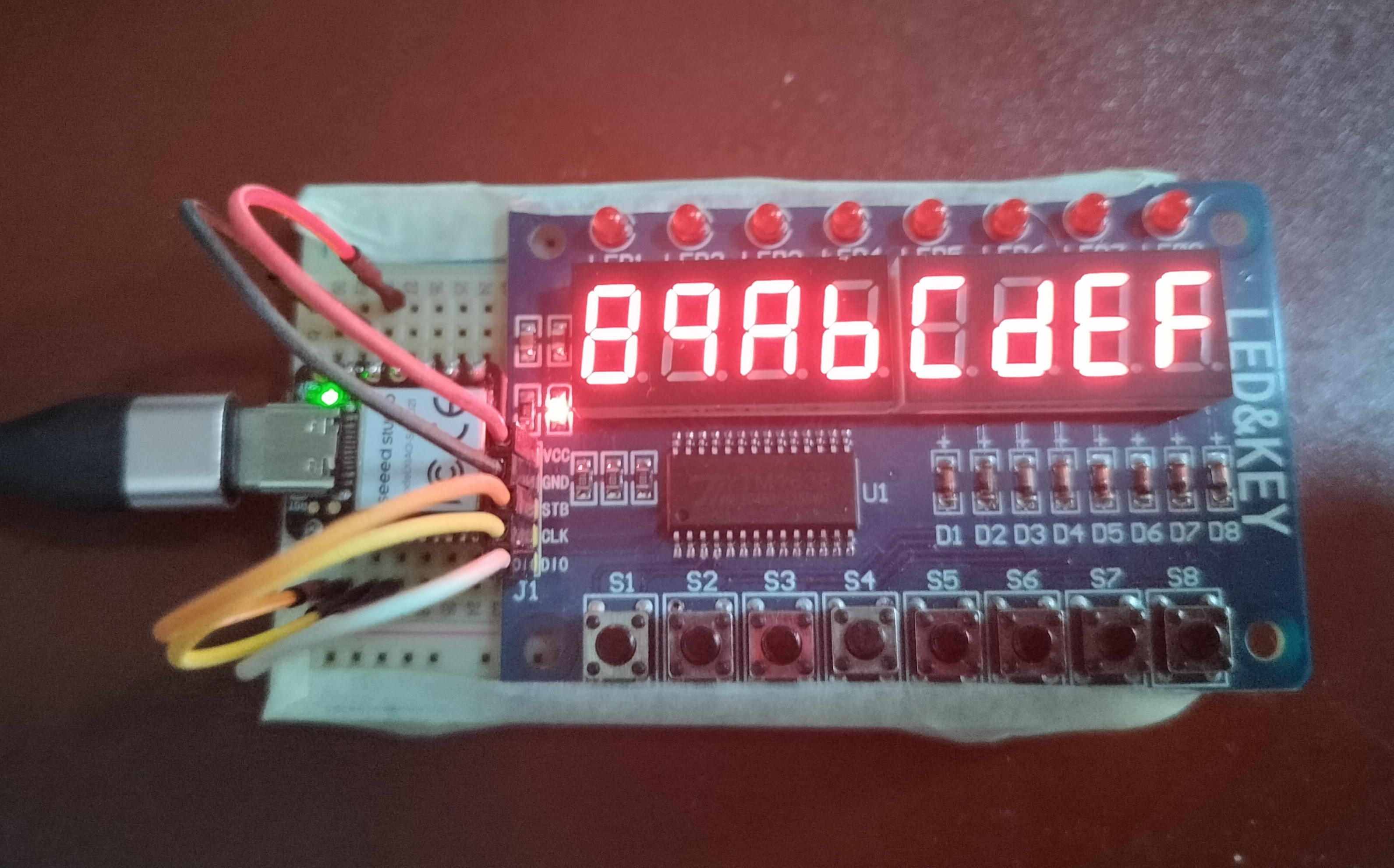 The fun part of this board is programming the seeeduino or Uno to run the tm1638 Chip and not so much the result accomplished with 8 push buttons, 8 7-segment displays and 8 LEDs.